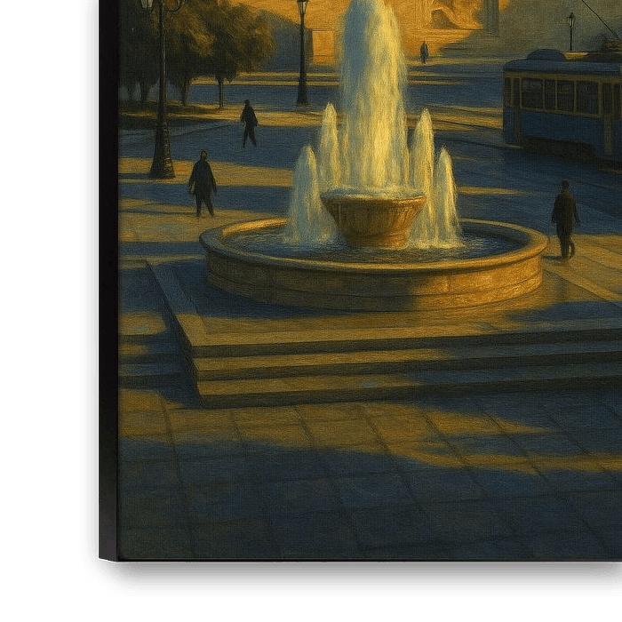 Diese Szene fängt den lebendigen Rhythmus von Athen ein - Ordnung, Anmut und Bewegung in der Stille. Die Komposition stellt ein Gleichgewicht zwischen architektonischer Symmetrie und menschlicher Präsenz her, wobei sich neoklassizistische Pracht mit alltäglicher Poesie vermischt. Das sanfte Zusammenspiel von Blau- und Bernsteintönen schafft eine Atmosphäre, die sowohl modern als auch antik wirkt und die ewige Dualität der Stadt widerspiegelt.