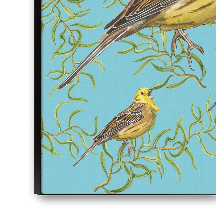 Gelbe Ammern in einer gewundenen Weide mit Vintage-Look. Illustration und Design Jasper the Horseman.