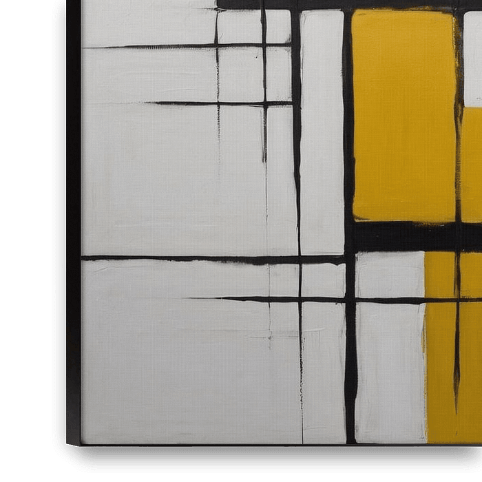 Tauchen Sie ein in die Welt des minimalistischen Glanzes mit diesem faszinierenden Kunstwerk. Die leuchtend gelben und schwarzen Oberflächen stehen in perfektem Gleichgewicht mit beruhigenden Weiß- und Grautönen und schaffen ein Spiel visueller Kontraste, das den Betrachter zum Nachdenken anregt. Die klaren Linien und Flächen verbinden…