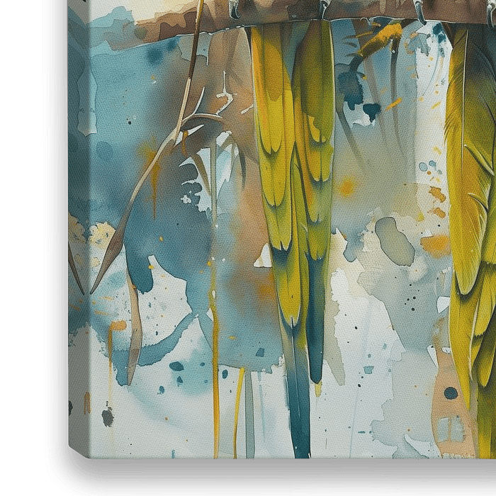 Bestelle dieses Vögel Wandbild Gelbe Papageien von ARTemberaubend als Reproduktion auf Leinwand, Alu-Dibond, als Poster, Fototapete, ArtFrame oder Acrylglasbild, maßgefertigt in höchster Qualität.