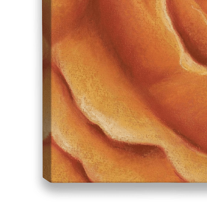 Eine Nahaufnahme einer wunderschönen Rosenblüte in leuchtenden Schattierungen von Gelb und Orange zeigt ihre zarten spiralförmigen Blütenblätter, die von der Mitte ausstrahlen. Die leuchtenden Farbtöne und Schattierungen betonen die zarte Struktur und natürliche Schönheit der Blüte.