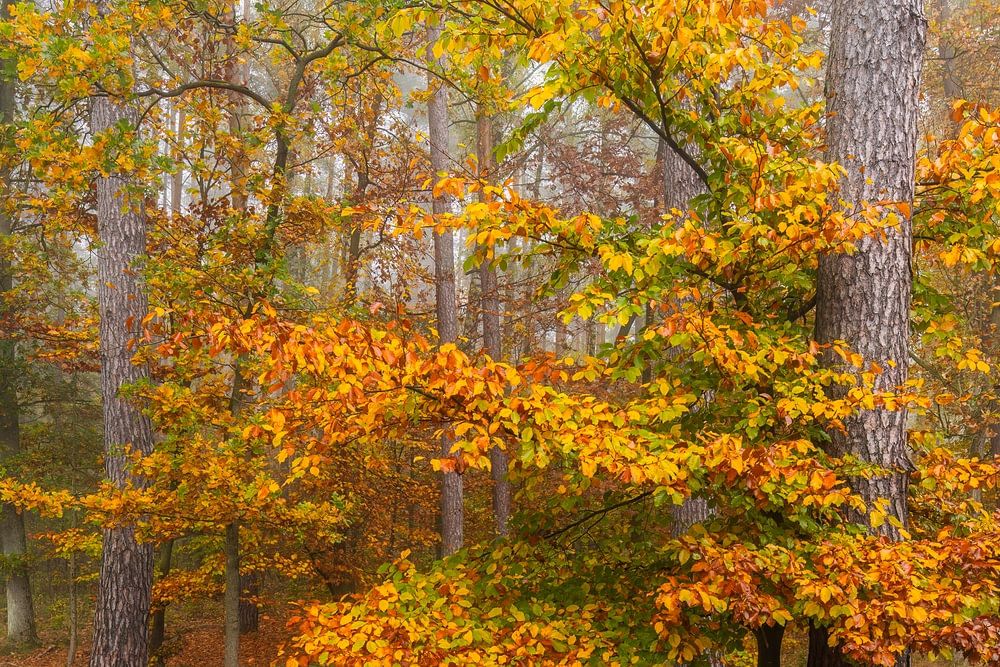 Im nebeligen Nadelwald wächst eine Buche direkt neben einer Fichte. Ihr herbstliches Laub bringt Farbe in den Wald.