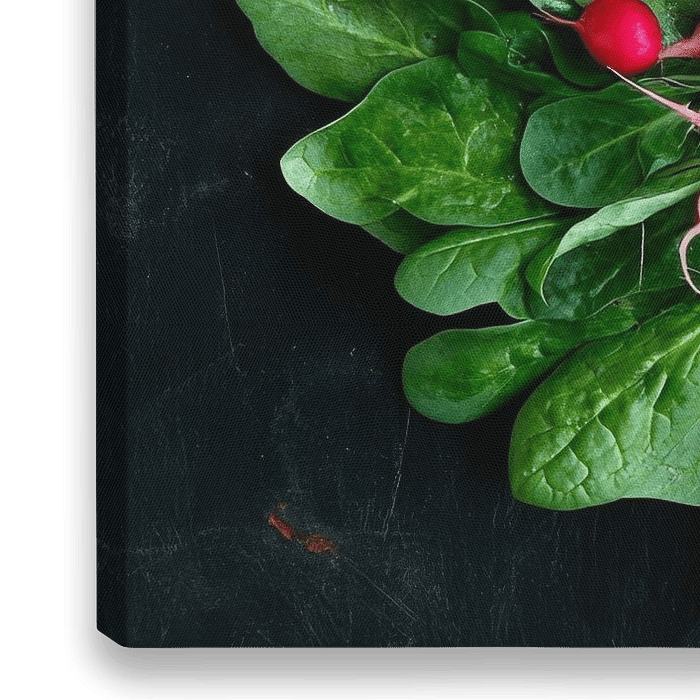Eine üppige Anordnung lebendiger Radieschen, leuchtender Kirschtomaten und frischgrüner Blattgemüse entfaltet sich wie ein Kunstwerk auf einem dunklen Hintergrund. Die harmonische Farbkombination zieht das Auge an und erweckt den Appetit. Perfekt für die Küche, bringt es eine frische Aura und inspiriert zu gesunden kulinarischen…