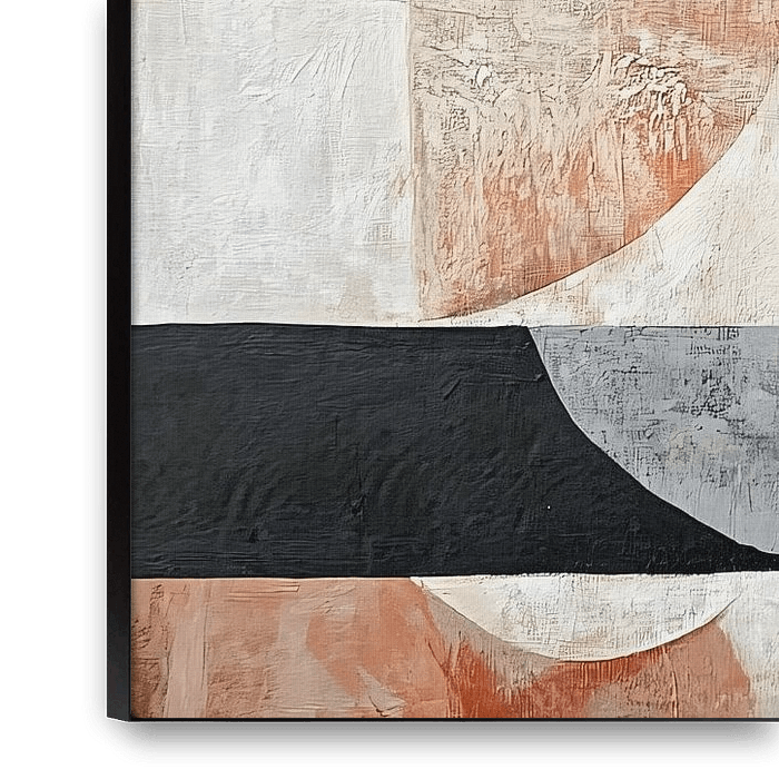 Dieses abstrakte Design kombiniert weiche, erdige Töne wie Orange, Grau, Beige und Weiß mit starken geometrischen Formen wie Kreisen und Rechtecken. Das Zusammenspiel von Linien und Flächen schafft einen dynamischen und modernen Look, der sich perfekt für zeitgenössische Innenräume eignet. Die verschiedenen Schichten und Texturen…