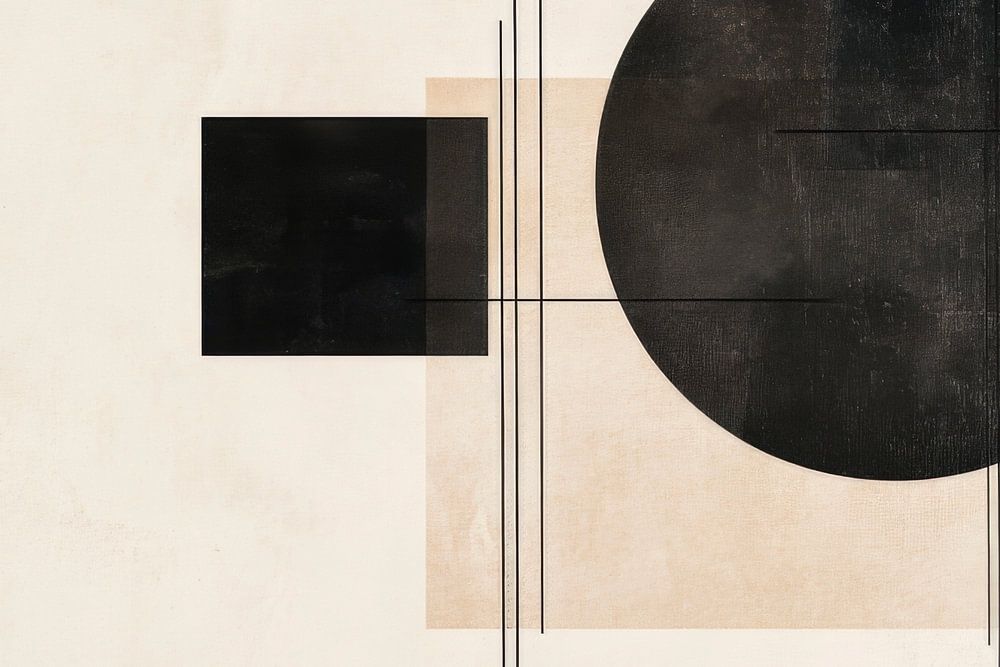 Ein harmonisches Zusammenspiel geometrischer Formen entfaltet sich auf dieser minimalistischen Leinwand. Ein dominanter schwarzer Kreis kontrastiert mit klaren, rechteckigen Blöcken und subtilen Linien, die sich elegant durch den Raum ziehen. Die sanften Erdtöne im Hintergrund verleihen dem Bild eine ruhige, zeitlose Ästhetik, die den Betrachter in einen meditativen Zustand versetzt.