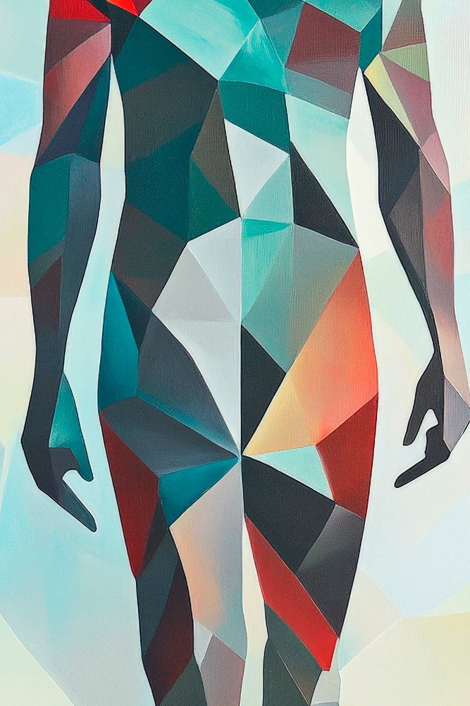Eine faszinierende Silhouette, kunstvoll in facettenreichen Farben gestaltet, verkörpert den menschlichen Geist und die Freiheit der Bewegung. Diese geometrische Darstellung verleiht jedem Raum eine moderne und inspirierende Atmosphäre, perfekt geeignet für ein stilvolles Wohnzimmer oder ein anregendes Büro, wo Kreativität und Selbstreflexion gedeihen können.