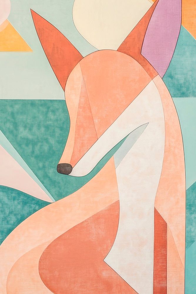 Sanfte Farben und geometrische Formen umrahmen einen stilisierten Fuchs, der mit neugierigen Augen in die Ferne blickt. Die harmonische Komposition von Naturmotiven und der warmen Farbpalette verleiht jedem Raum eine einladende Atmosphäre, ideal für ein Wohnzimmer, in dem Kreativität und Entspannung Hand in Hand gehen.