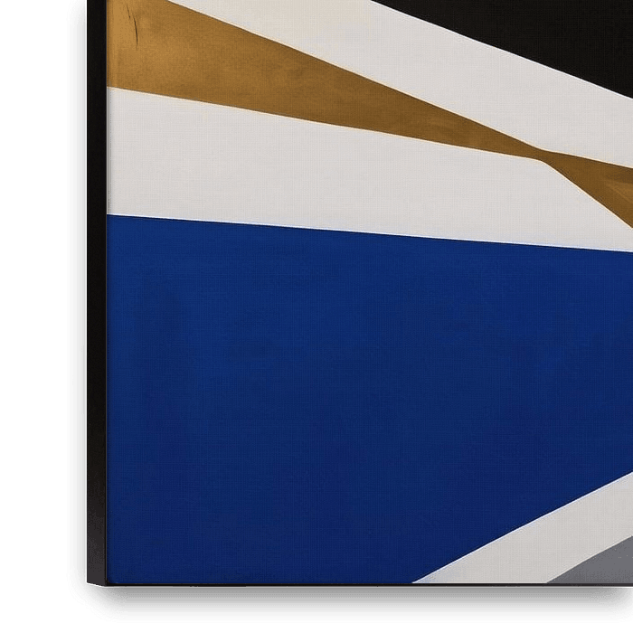 Dieses Kunstwerk stellt eine dynamische Komposition geometrischer Formen dar, mit einer spannenden Kombination von Farbflächen und Linien, die ineinander übergehen. Die Farben Blau, Schwarz, Weiß, Gold und Grau werden strategisch eingesetzt, um Tiefe und Bewegung zu erzeugen. Das Design strahlt Modernität aus und ist perfekt für alle,…