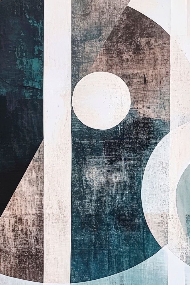 Dynamische Formen in tiefen Blau- und Grautönen treffen auf frische Akzente in Weiß, harmonisch kombiniert zu einem modernen Ausdruck. Die kraftvollen Kreise und geometrischen Linien erzeugen eine Energie, die zum Nachdenken anregt. Ideal für ein kreatives Büro oder ein inspirierendes Wohnzimmer, wo Stil und Funktionalität kunstvoll verschmelzen.