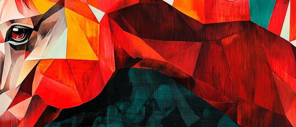 In einer Explosion aus leuchtenden Rot- und Orangetönen entfaltet sich das elegante Profil eines Pferdes, kunstvoll in geometrischen Formen gebrochen. Diese dynamische Komposition verleiht jedem Raum eine lebendige Energie und ist ideal für das Wohnzimmer, wo sie Gespräche anregen und die Fantasie beflügeln kann.