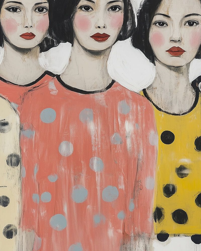Dotted Harmony ist eine abstrakte Kunstdarstellung von fünf Frauen mit dunklen kurzen Haaren, die jeweils Kleider mit einem verspielten Punktmuster tragen. Die Farben Rot, Gelb, Schwarz und Weiß wechseln sich ab, wobei die Kontraste dieser Farbtöne harmonisch zusammenkommen. Die Frauen stehen nebeneinander vor einem minimalistischen weißen Hintergrund, der den Fokus auf die lebhaften Muster und Farben ihrer Kleidung legt. Ihre stilisierten Silhouetten strahlen trotz der Vielfalt an Farben und Mustern ein Gefühl von Einheit und Ausgewogenheit aus. Das Ganze wirkt wie ein Tanz zwischen Form und Farbe, bei dem sich Einfachheit und Abstraktion treffen. Moderne Abstraktion.