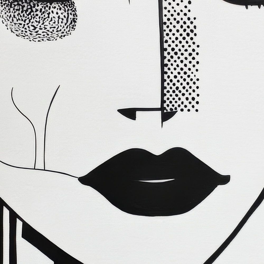 Mit einem faszinierenden Spiel aus geometrischen Formen und kontrastierenden Schwarz-Weiß-Tönen entfaltet sich ein Gesicht, das sowohl Stärke als auch Zartheit ausstrahlt. Die hypnotisierenden Augen ziehen den Betrachter in ihren Bann, während die grafischen Muster und Linien eine moderne, künstlerische Aura schaffen. Ein Ausdruck von Individualität und Mystik, der zum Staunen einlädt.