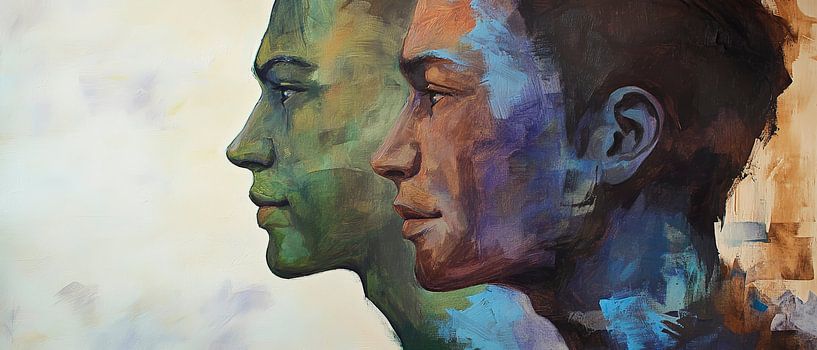 Zwei stilisierte Profile in harmonischen Farbtönen von Blau und Grün erzählen Geschichten der Begegnung und Reflexion. Ihre sanften Linien und die interessante Farbkomposition verleihen jedem Raum eine moderne Note. Ideal für ein Wohnzimmer oder ein kreatives Büro, wo Gedanken und Ideen fließen können.