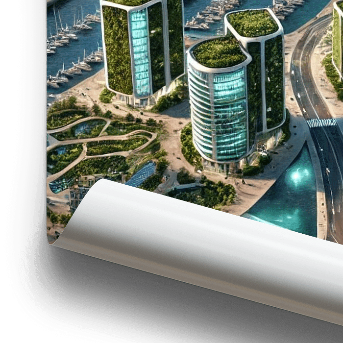 Dieses eindrucksvolle digitale Poster zeigt eine futuristische Vision von Gibraltar, in der innovative Architektur und Nachhaltigkeit perfekt miteinander verschmelzen. Der berühmte Felsen von Gibraltar ragt majestätisch im Hintergrund auf,…