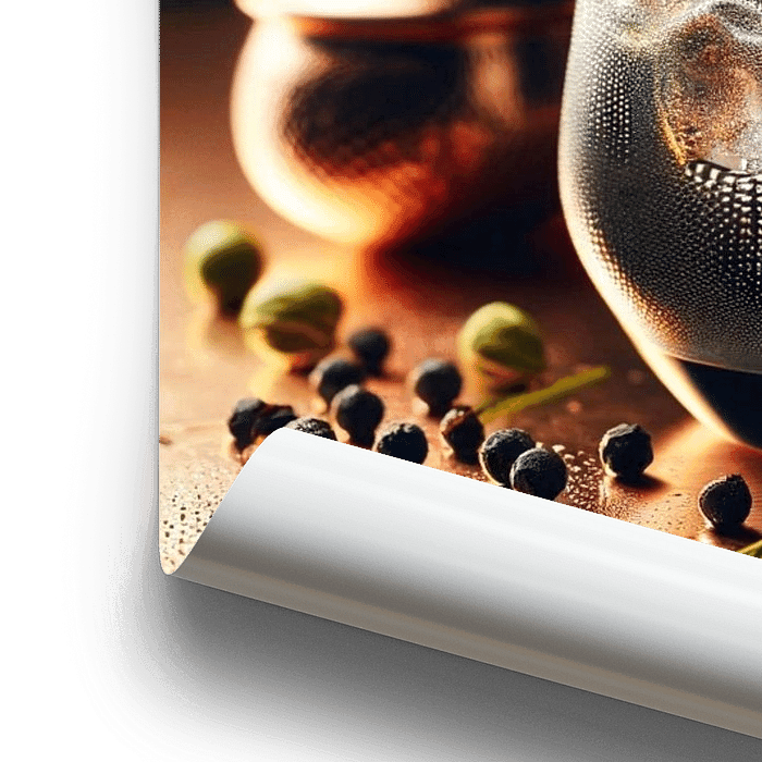 Der Gin & Tonic, eine zeitlose Mischung aus Gin, Tonic Water und frischem Limettensaft, wird durch die moderne Kunstform in einem neuen Licht präsentiert. Das funkelnde Spiel des Lichts auf der Oberfläche des Getränks und der benachbarten Kupferutensilien fügt eine warme, einladende Atmosphäre hinzu.