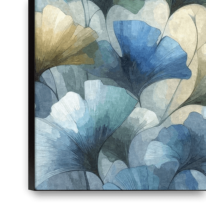 Zarte Ginkgoblätter in Blau, Grün und Beige schweben über einen fließenden Hintergrund. Die feinen Linien und Farbverläufe erzeugen eine ruhige, meditative Stimmung. Dieses texturierte Aquarell eignet sich ideal für Räume, die Balance und Naturverbundenheit ausstrahlen sollen. Der Ginkgo steht für Hoffnung, Widerstandskraft und…