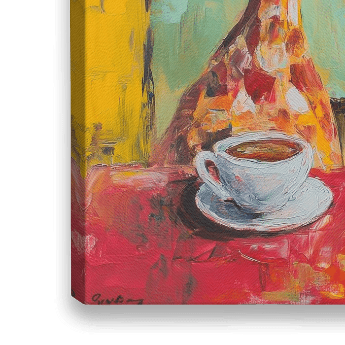 Bestelle diese Malerei Giraffe im Café mit Eiffelturm von Poster Art Shop als Reproduktion auf Leinwand, Alu-Dibond, als Poster, Fototapete oder Acrylglasbild.