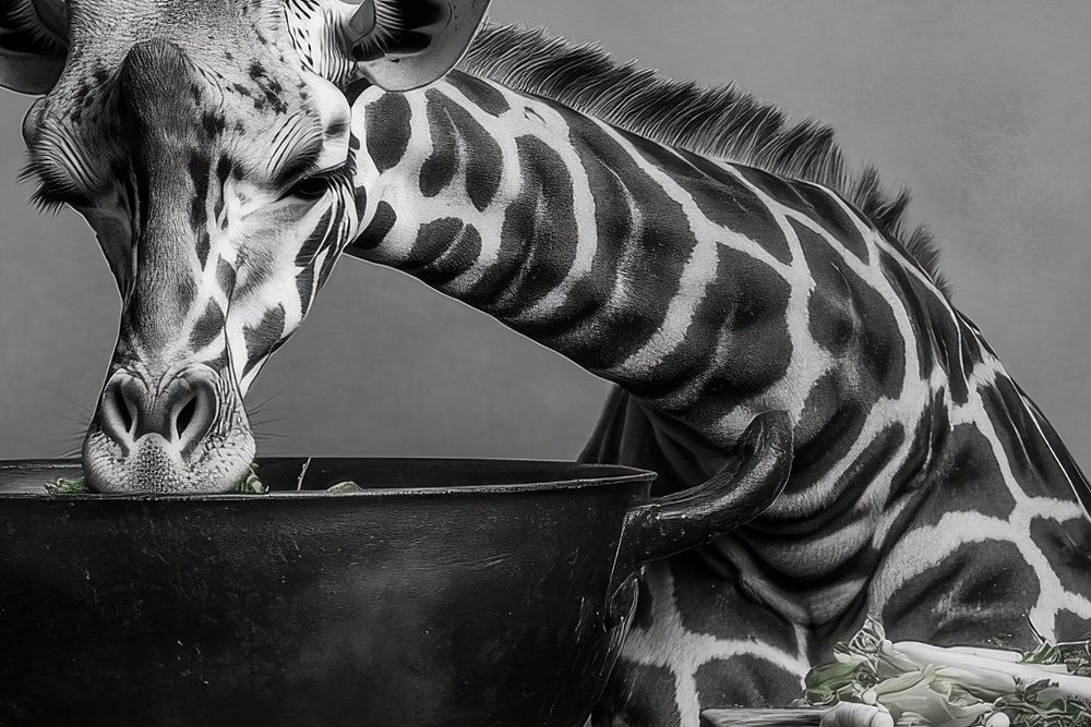 Eine verspielte Giraffe, die neugierig über den Rand eines großen Kochtopfs späht, bringt sofort Freude und Vielfalt in jeden Raum. Umgeben von frischen Zutaten und einem Hauch von Magie wird die Küche zum kreativen Zentrum. Dieses faszinierende Bild inspiriert zu gastronomischen Abenteuern und verleiht dem Raum einen einzigartigen Charme.