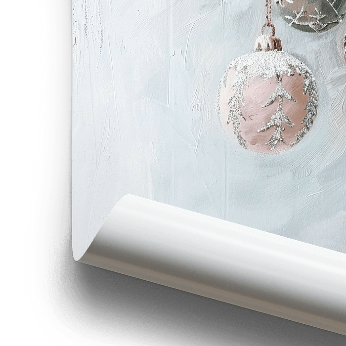 Glänzende Weihnachtskugeln auf Zweigen - Dieses Weihnachtsgemälde zeigt geschmückte Kugeln, die an verschneiten Tannenzweigen hängen, jede einzigartig detailliert mit Mustern und schimmernden Akzenten vor einem sanften farbigen Hintergrund.
