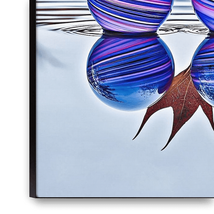 Dieses Kunstwerk kombiniert eine ruhige natürliche Umgebung mit auffälligen Glaskugeln und Herbstblättern, die zusammen eine magische Spiegelung im Wasser erzeugen. Die Verwendung von leuchtenden Farben wie Blau und Violett bildet einen bezaubernden Kontrast zu den warmen Herbsttönen. Dieses Design ist ideal als Wanddekoration und…