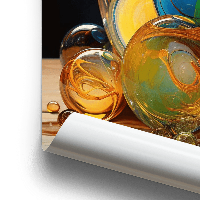 Dieses Gemälde präsentiert ein schillerndes Stillleben aus Glasmurmeln und -kugeln, die in einem Zustand der leuchtenden Fließfähigkeit eingefangen sind. Die Kugeln reflektieren und brechen das Licht intensiv, wodurch komplexe innere Wirbel aus leuchtendem Orange, Cyan und tiefem Ultramarinblau sichtbar werden. Sie sind auf einer spiegelnden, dunklen Holzoberfläche arrangiert, die die Farben in glänzenden Pfützen widergibt. Eine große, klare Kugel im Hintergrund dient als Lupe für die darin enthaltenen Formen. Das Bild feiert die Transparenz und die visuelle Dynamik von Glas und Licht, wobei die intensiven Farbwirbel eine kosmische oder galaktische Anmutung erzeugen.