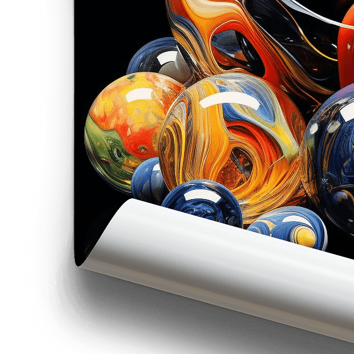Dieses Gemälde präsentiert ein schillerndes Stillleben aus Glasmurmeln und -kugeln, die in einem Zustand der leuchtenden Fließfähigkeit eingefangen sind. Die Kugeln reflektieren und brechen das Licht intensiv, wodurch komplexe innere Wirbel aus leuchtendem Orange, Cyan und tiefem Ultramarinblau sichtbar werden. Sie sind auf einer spiegelnden, dunklen Holzoberfläche arrangiert, die die Farben in glänzenden Pfützen widergibt. Eine große, klare Kugel im Hintergrund dient als Lupe für die darin enthaltenen Formen. Das Bild feiert die Transparenz und die visuelle Dynamik von Glas und Licht, wobei die intensiven Farbwirbel eine kosmische oder galaktische Anmutung erzeugen.