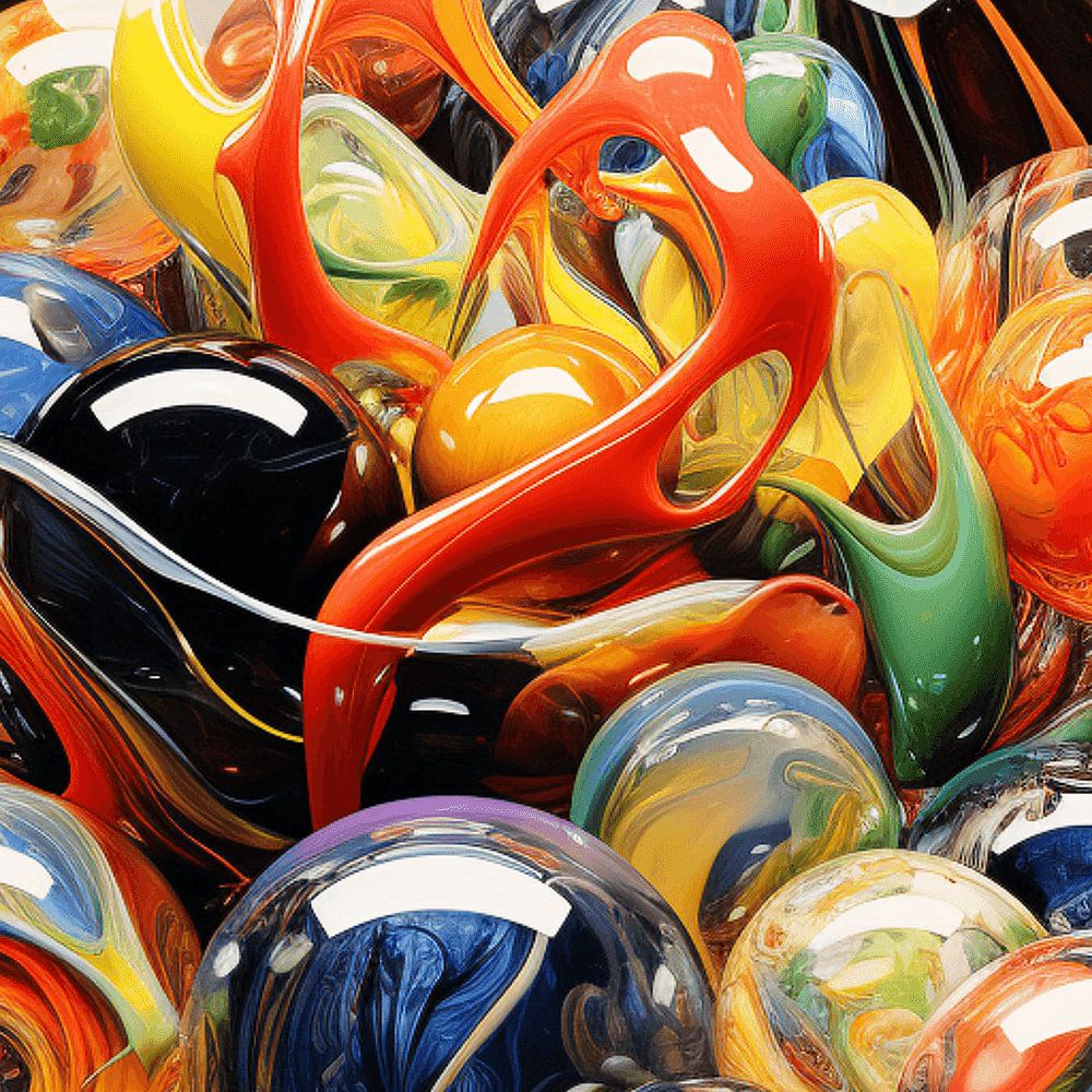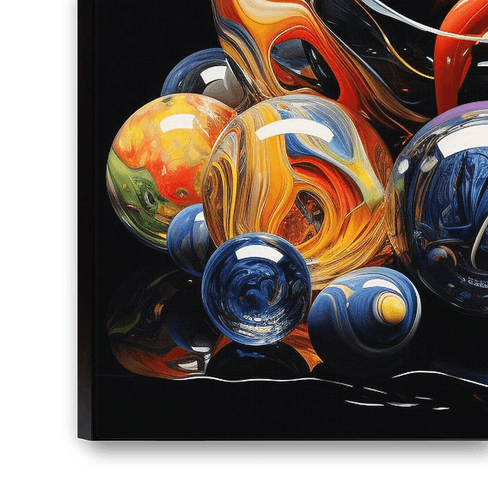 Dieses Gemälde präsentiert ein schillerndes Stillleben aus Glasmurmeln und -kugeln, die in einem Zustand der leuchtenden Fließfähigkeit eingefangen sind. Die Kugeln reflektieren und brechen das Licht intensiv, wodurch komplexe innere Wirbel aus leuchtendem Orange, Cyan und tiefem Ultramarinblau sichtbar werden. Sie sind auf einer spiegelnden, dunklen Holzoberfläche arrangiert, die die Farben in glänzenden Pfützen widergibt. Eine große, klare Kugel im Hintergrund dient als Lupe für die darin enthaltenen Formen. Das Bild feiert die Transparenz und die visuelle Dynamik von Glas und Licht, wobei die intensiven Farbwirbel eine kosmische oder galaktische Anmutung erzeugen.