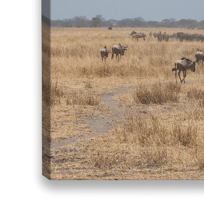 Gnus, die in der Savanne des Tarangire-Nationalparks in Tansania, Afrika, sammeln. Das trockene Gras kontrastiert mit dem leicht bewölkten Himmel.