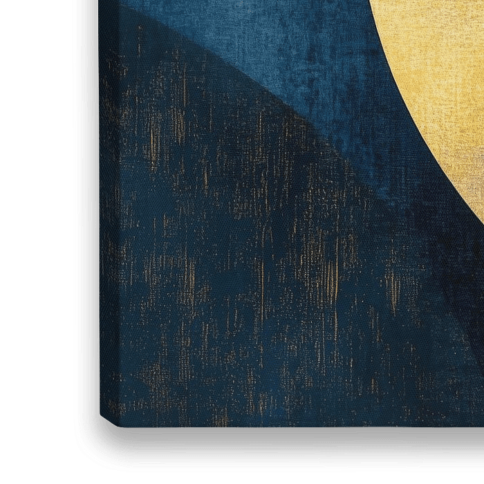 Schimmernde Goldtöne verschmelzen mit tiefen Blau- und Weißnuancen zu einem faszinierenden Zusammenspiel geometrischer Formen. Die harmonische Anordnung der geschwungenen Linien strahlt Ruhe und Eleganz aus, was dieses Kunstwerk perfekt für ein stilvolles Wohnzimmer macht, wo es anziehende Gespräche und eine inspirierende Atmosphäre…