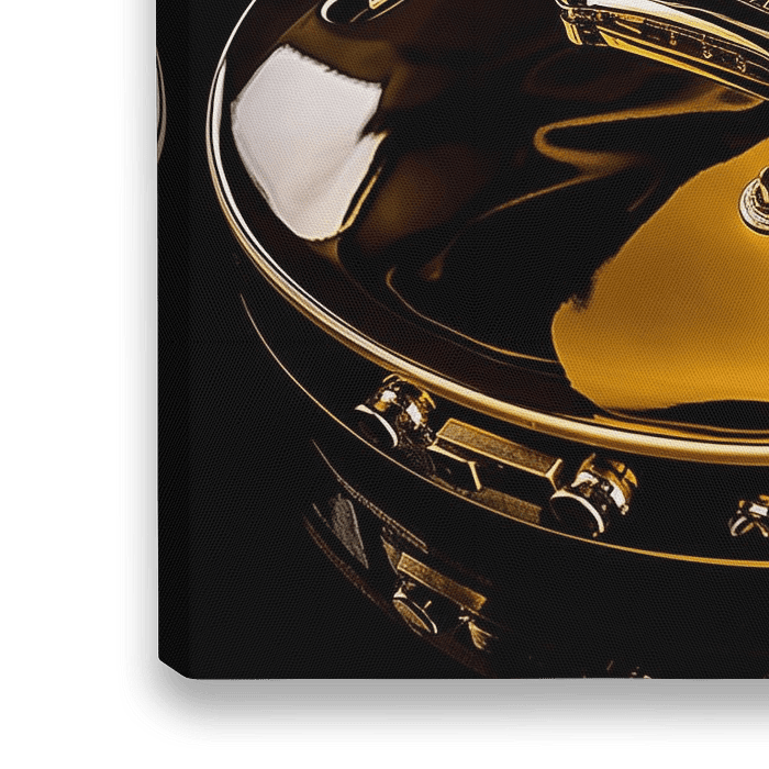 Einzigartiges goldenes Gitarren-Porträtbild mit atemberaubendem Stil. Mit schönen Farbtönen und einem einzigartigen Design ist dies ein stilvoller Fotodruck, der in jedem Raum gut aussieht.