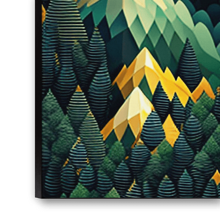 Dieses Bild zeigt eine stilisierte Berglandschaft mit scharfkantigen Gipfeln in leuchtenden Grün- und Gelbtönen, die durch üppige, abstrakte Wälder ergänzt werden. Die geometrischen Formen erzeugen ein vielschichtiges und dynamisches Bild, während das goldene Sonnenlicht das Spiel von Licht und Schatten auf dem Gelände verstärkt. Die Komposition ist eine harmonische Mischung aus natürlicher Schönheit und künstlerischer Abstraktion, die ein Gefühl von Abenteuer in einer ruhigen Wildnis hervorruft. Die sich überlagernden Berge gehen anmutig in den Hintergrund über und verleihen Tiefe und Perspektive, während das Zusammenspiel der Formen eine bezaubernde, fast surreale Atmosphäre schafft.