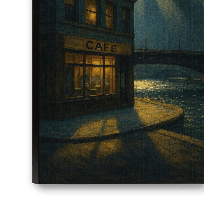 Hoppers Einfluss ist hier noch spürbar - der Dialog zwischen Licht und Einsamkeit - aber dieses Chicago spricht mehr von Hoffnung als von Isolation, von goldenem Licht, das die Stille der Stadt durchbricht.