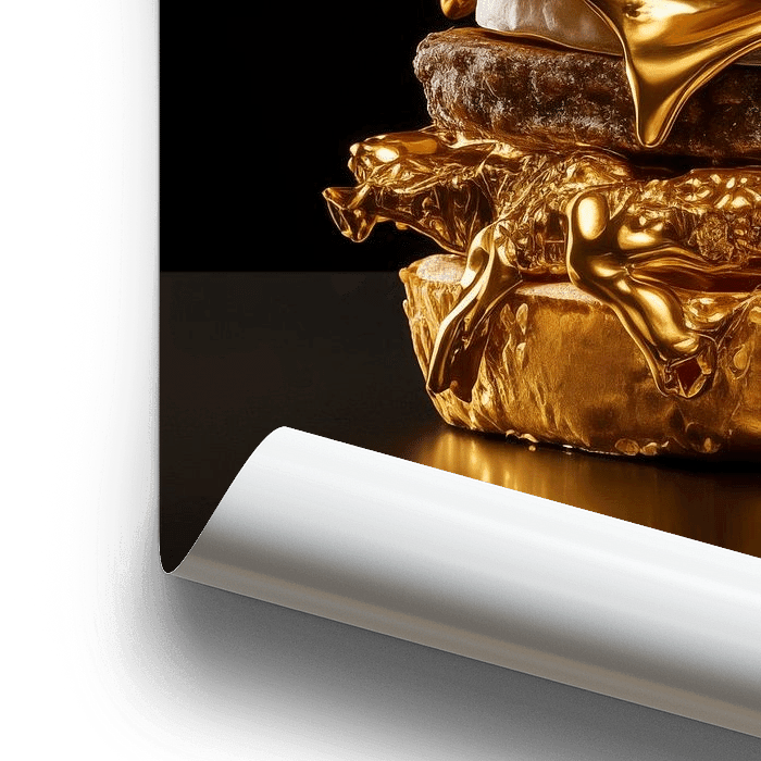 Dieses Kunstwerk zeigt ein goldenes Hamburgerbrötchen. Der Käse ist geschmolzen und sieht aus wie geschmolzenes Gold. Das Brötchen ist ebenfalls aus Gold. Das Brötchen spiegelt sich im Vordergrund. Der Hintergrund ist schwarz.