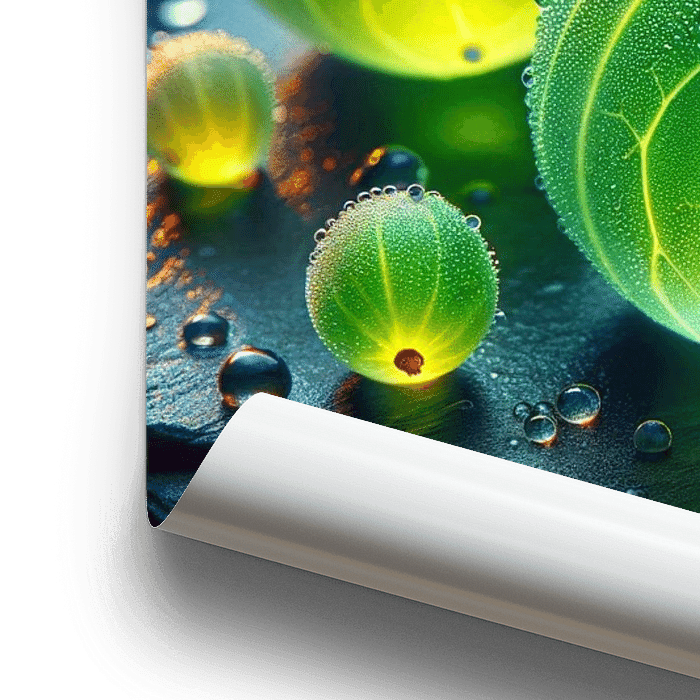 "Gooseberries Glowing Like Little Lanterns" ist ein atemberaubendes mit DALL-E generiertes Meisterwerk digitaler Kunst, das die Essenz moderner Food-Styling-Techniken einfängt und in ein surreales Bild umwandelt, das die Sinne belebt. Diese Komposition präsentiert Stachelbeeren in einem magischen Licht, als ob sie kleine Laternen wären, die in der Dunkelheit leuchten. Die Früchte sind mit winzigen Wassertropfen bedeckt, die wie feine Juwelen glänzen und das einfallende Licht brechen, was die Illusion von innerer Leuchtkraft noch verstärkt.