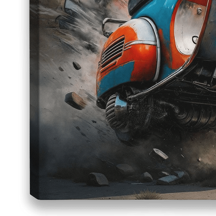 Dynamische Darstellung einer Vespa vor einem Graffiti-Hintergrund. Die kraftvolle Komposition und die lebendigen Farben erzeugen ein Gefühl von Bewegung und Energie. Das Bild vereint Elemente der Street Art mit der nostalgischen Ästhetik eines klassischen Rollers.