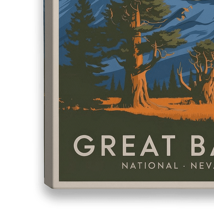 Ein majestätischer Berg mit funkelnden Sternen und einem Hauch von Mystik dominiert die Szenerie. Die warmen Erdtöne harmonieren mit der kühlen Nacht, während alte Bäume eine Atmosphäre von Ruhe und Naturverbundenheit schaffen. Dieses Kunstwerk bringt den Zauber des Great Basin in dein Wohnzimmer und wird zum Gesprächsthema für jeden Gast.