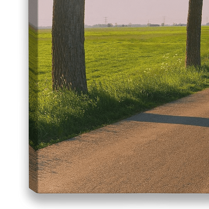 Der Jukwerderweg, eine lokale Straße mit Bäumen, eine typische Groninger Landschaft in der Nähe der Stadt Appingedam im Norden der Niederlande an einem schönen Sommerabend.