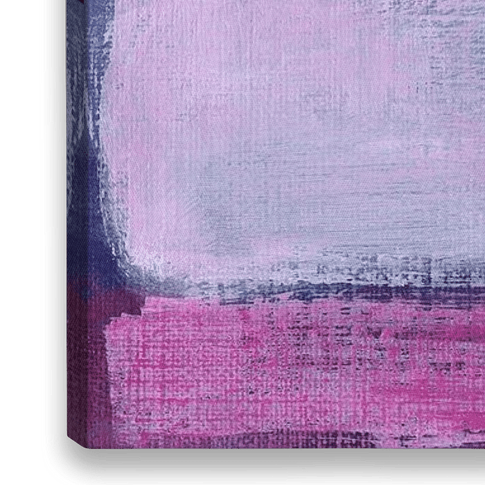 Das abstrakte Bild ist mit lockeren Pinselstrichen in Lila- ,Rosa- und Blautönen gemalt. Über dem unteren Drittel in dunkleren Rosa- und Lilatönen erstreckt sich ein großes Rechteck in hellen…