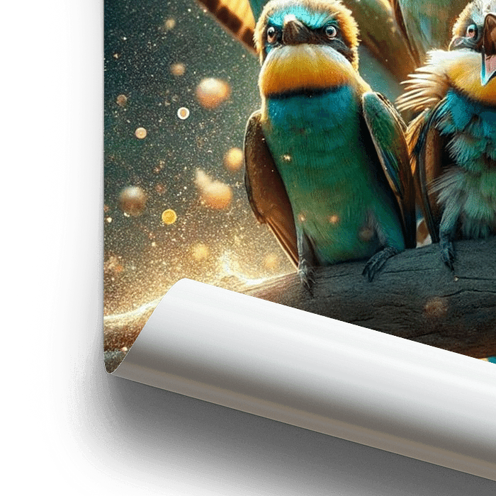 Dieses atemberaubende Poster bringt den Betrachter direkt in die leuchtende Welt der farbenprächtigen Bienenfresser (Bee-Eaters) – einer der schönsten Vogelarten überhaupt. Auf einem Ast versammelt, blicken neun dieser gefiederten Juwelen neugierig und lebendig in die Kamera. Ihre intensiv türkisgrünen Körper, das leuchtende Orange und Gelb an Brust und Kehle sowie die feinen blauen Akzente in den Flügeln machen sie zu echten Blickfängen. Unterstützt wird die Szenerie durch das warm strahlende Sonnenlicht, das von hinten einfällt und die Silhouetten sowie die flirrenden Staubpartikel magisch in Szene setzt. Das Bild wirkt dadurch wie aus einem Traum – natürlich und doch fast surreal schön.