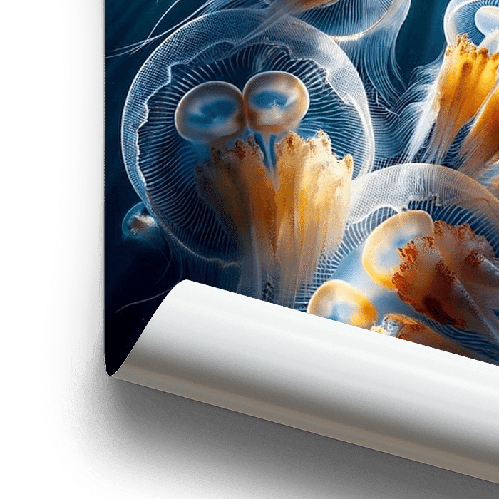 Quallen sind faszinierende Meeresbewohner, bekannt für ihre gelatinöse Beschaffenheit und ihre Fähigkeit, im Wasser zu treiben, anstatt aktiv zu schwimmen. Die hier dargestellten Kreaturen reflektieren das Licht in einer Weise, die ihre zarten Formen und die vielfältigen Farben ihrer inneren Strukturen hervorhebt.