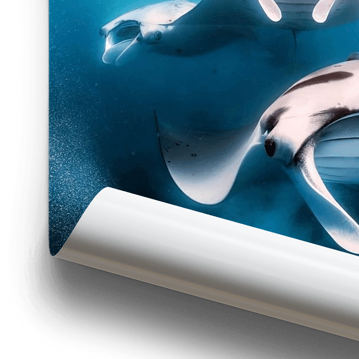 "Group of Manta Rays" präsentiert eine Gruppe von Manta Rochen, die sich in einem sanften, koordinierten Tanz durch die Tiefen des Meeres bewegen. Die majestätischen Kreaturen, mit ihren weit gespannten Flossen, die wie die Flügel eines Vogels anmuten, schwimmen in perfekter Harmonie, fast als würden sie den Sonnenstrahlen folgen, die…