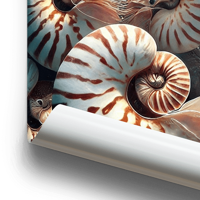 Dieses atemberaubende Poster entführt den Betrachter in die geheimnisvolle Welt der Tiefsee. Im Fokus stehen mehrere Nautilus-Muscheln, die mit ihrer beeindruckenden Spiralform und den eleganten, rot-weißen Streifen sowohl Ästhetik als auch Perfektion der…