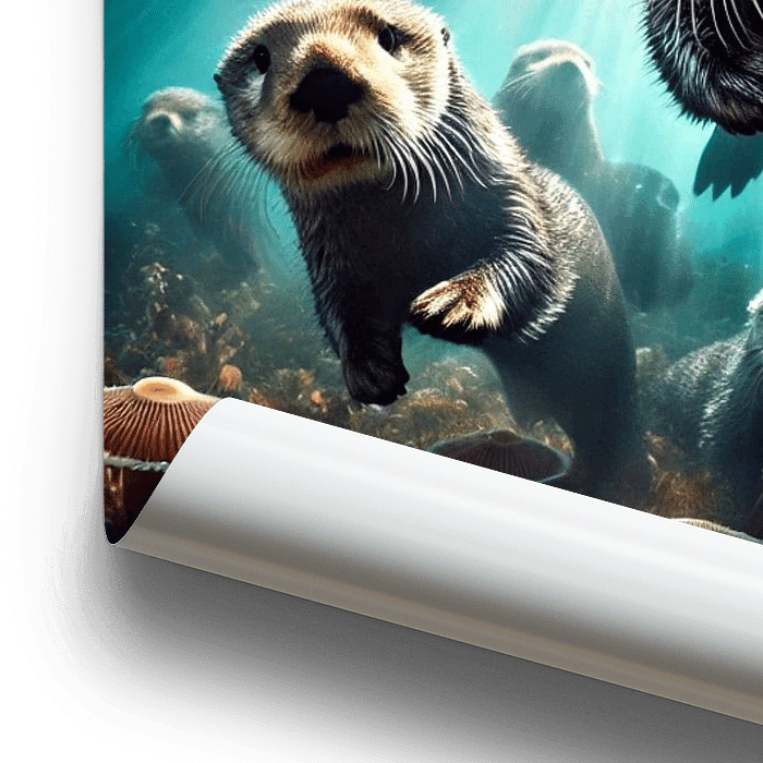 Dieses bezaubernde Poster zeigt eine Gruppe von verspielten Seeottern, die unter der Meeresoberfläche schweben, während Sonnenstrahlen durch das kristallklare Wasser brechen. Die neugierigen Gesichter der Otter mit ihren großen, dunklen Augen ziehen den Betrachter sofort in ihren Bann. Umgeben von faszinierenden Meereskorallen und…
