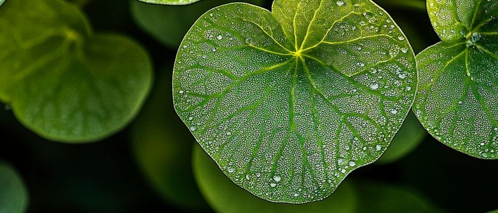 Satte Grüntöne und zarte Wassertropfen umarmen die herzförmigen Blätter, die eine frische, beruhigende Atmosphäre ausstrahlen. Diese Pflanzenlandschaft, voller Leben und Vitalität, verleiht jedem Raum eine natürliche Eleganz. Ideal für die Küche, bringt sie einen Hauch von Natur und Frische, der das Kochen und Genießen bereichert.