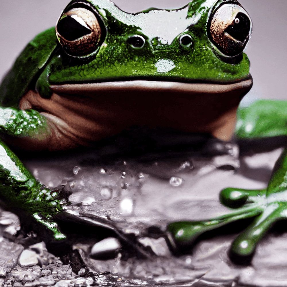 Ein leuchtend grüner Frosch mit großen, goldenen Augen sitzt auf einem grauen, steinigen Untergrund, umgeben von klarem Wasser und fallenden Tropfen. Die Haut des Frosches ist glänzend und feucht, und seine charakteristischen großen Augen verleihen ihm einen aufmerksamen Ausdruck. Das Wasser ist ruhig, mit sanften Wellen und reflektiert die Umgebung leicht. Die fallenden Tropfen erzeugen kleine Kräuselungen auf der Wasseroberfläche. Der Hintergrund ist in sanften Grautönen gehalten, was den Fokus auf den Frosch und die Wassertropfen lenkt. Die Szene fängt einen ruhigen Moment in der natürlichen Umgebung des Frosches ein.