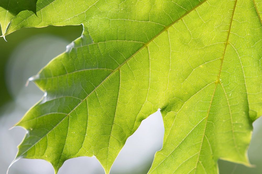 Ein grünes Blatt hängt am Baum,. Von hinten scheint die Sonne durch die Zweige und lässt das Blatt erstrahlen. Lichtreflexe im Hintergrund.