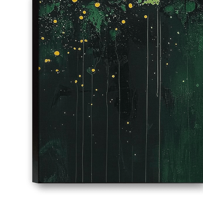 Grüntöne fließen zusammen wie ein ruhiger, organischer Strom. Spritzer und Linien deuten auf Wachstum hin, und Gelb erhellt das Ganze, als würde das Sonnenlicht durchbrechen. Das Gemälde strahlt Ruhe, Natur und eine gedämpfte, fast traumhafte Lebendigkeit aus.