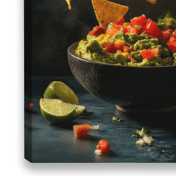 In einer dynamischen Szene feiern knusprige Tortilla-Chips mit frischen Tomaten und Limetten einen Gusto-Tanz. Die leuchtenden Farben von Guacamole und Gemüse verleihen diesem Kunstwerk eine einladende Frische. Perfekt für die Küche, bringt es die Freude am Kochen und Genießen in jeden Raum!
