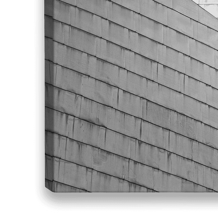 Ein 2:1-Foto in Schwarz-Weiß mit Nahaufnahmen des berühmten Guggenheim-Museums in der spanischen Stadt Bilbao mit seinen markanten Formen und seinem silbern und golden glänzenden Äußeren während eines Sonnenuntergangs an einem Sommerabend.