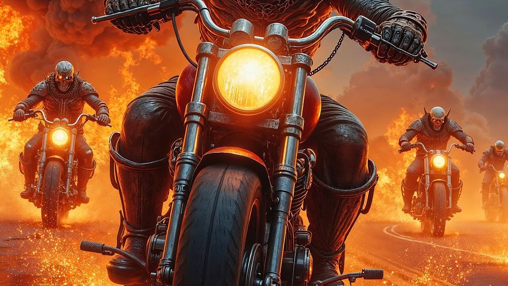Aus einer Wand aus Feuer und schwarzem Rauch bricht die Dämonenhorde hervor. Schädelgesichter leuchten im Infernoglühen, während schwere Motorräder über den Asphalt donnern und Funken hinterlassen. Die Straße wird zum Schlachtfeld, die Nacht zur Bühne ungezügelter Gewalt.